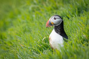 Atlantic puffin sitting in a newly dug burrow on Skomer Island, Wales (April 2024)